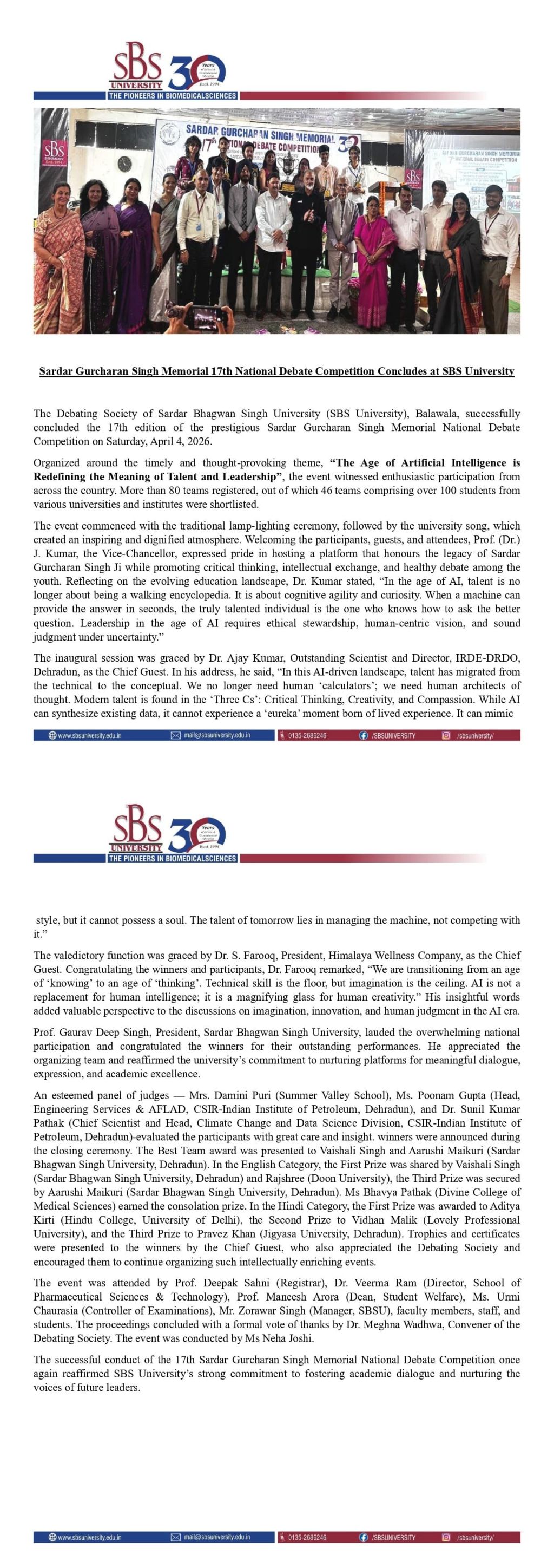 Sardar Gurcharan Singh Memorial 17th National Debate Competition Concludes at SBS University
